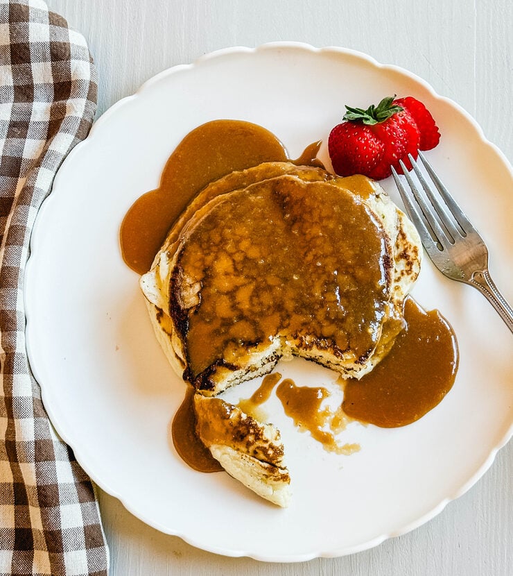 We all love breakfast at our house, and in addition to sour cream muffins, granola balls, and pumpkin bread (it’s fall!), pancakes are often at the top of the list. What’s not to love? We trade up the toppings, and once of the favorites is Cinnamon Roll Pancake Sauce. The combination of brown sugar, butter, cinnamon, and nutmeg, transform regular pancakes into a delightful treat.