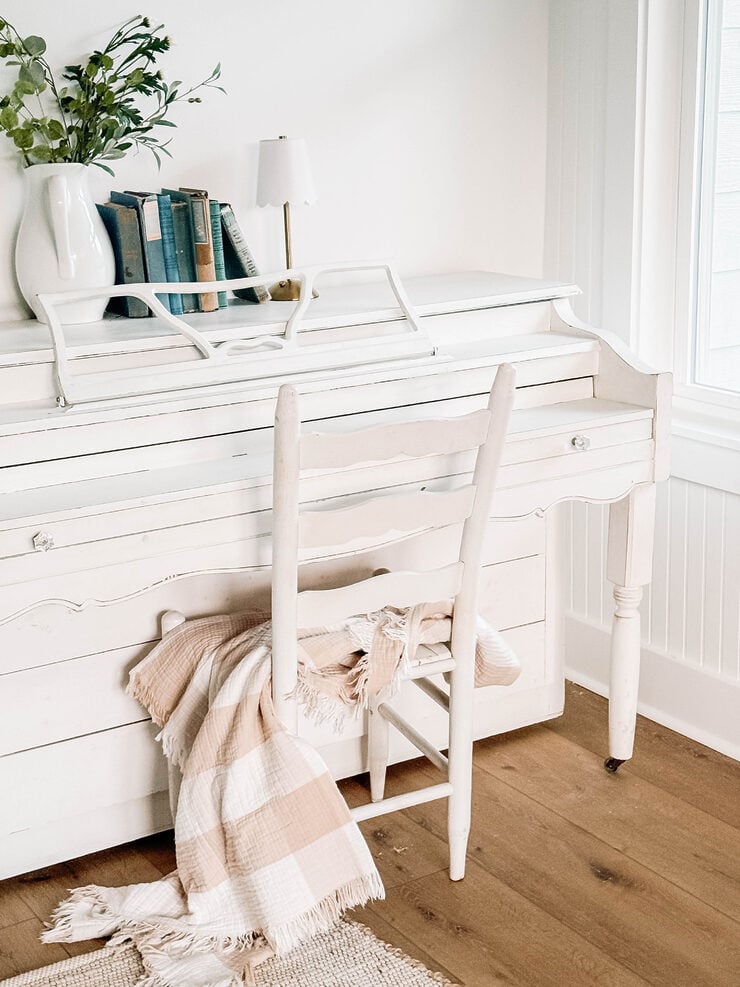 I highly recommend chalk paint when painting a piano. You don’t have to move it from it’s current position–just move it away from the wall, put it up on wood blocks, and add a drop cloth. It also requires no priming or sanding, which is HUGE. My piano had a smooth, shiny surface, and I would have been sanding for days and days to even get it close for a latex paint. It dries quickly, and you can add a second coat in less than an hour. I used Annie Sloan, Pure White. Another great option is to use BB Frosch Chalk Paint Powder. You can add it to any color latex paint, which just opens up the door if you’re looking for a specific color!