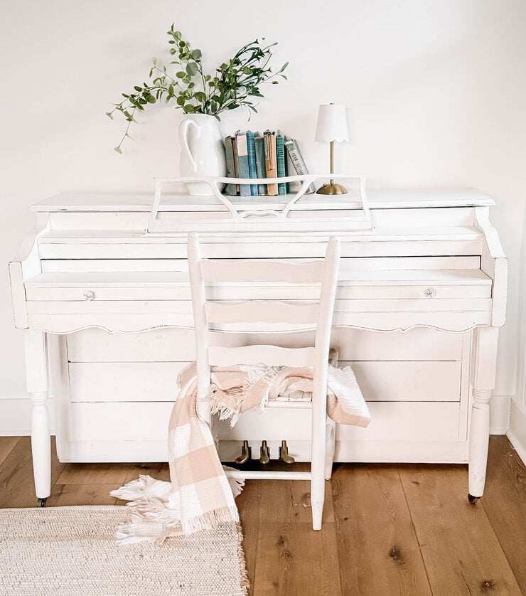 I changed the piano legs, added wood planks to the front panel, painted it with chalk paint, and added new hardware. The result is a complete transformation, and I almost can’t believe it’s the same piano!