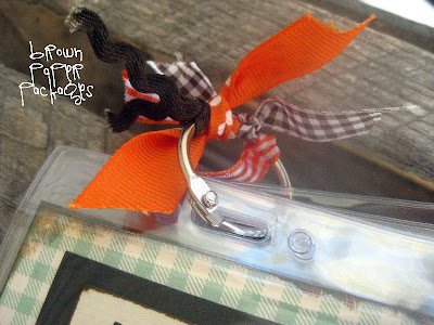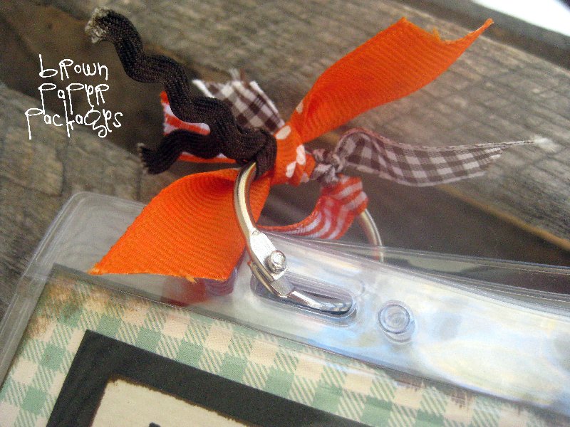 4. I created my desired text in another Word document (font Gentle Redhead), printed it, cut it out, distressed the edges, matted it on cardstock, then again on to my scrapbook paper. Once I placed it in the top name badge, I slid each of them on to the book ring, and finished it off with the ribbon.