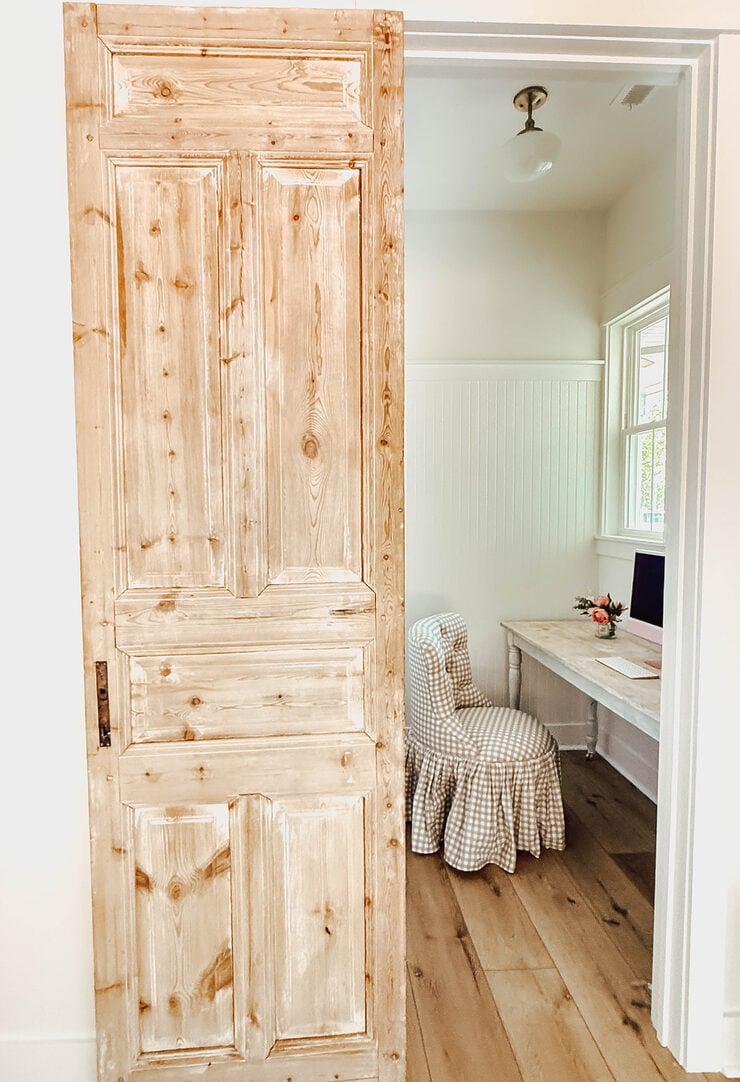 Before we even started building Cottage on Blackberry Hill, I knew that I wanted to find antique doors for a few places in our home. I started looking very early, because I thought it might take some time to find just the right thing. After searching and searching, I stumbled across a gold mine, and found doors for our library, entryway, my office, and our kitchen pantry. Each is so unique and absolutely stunning, featuring original glass and hardware. They are the star of the show, and I’m in love!