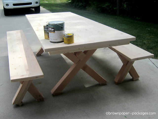 Step 4: For the last step, I added a finishing wax by Minwax. Since it was to be our kitchen table, I wanted to make sure that I could easily wash it, clean it, and provide a barrier for food and liquids that would get on it. The wax also makes the surface very smooth, which I especially wanted–no splinters at the table, lol! I followed the directions on the can, using cheesecloth to apply a very small amount over the table and benches, letting it try for 15 minutes, then buffing it out. (The timing is important!) Make sure to read and follow the directions on your can—it definitely makes a difference. It makes the surface so lovely and smooth–the perfect finish for our new kitchen table! WARNING: Make sure you love it before you add the wax, because once it’s on, it’s on!
