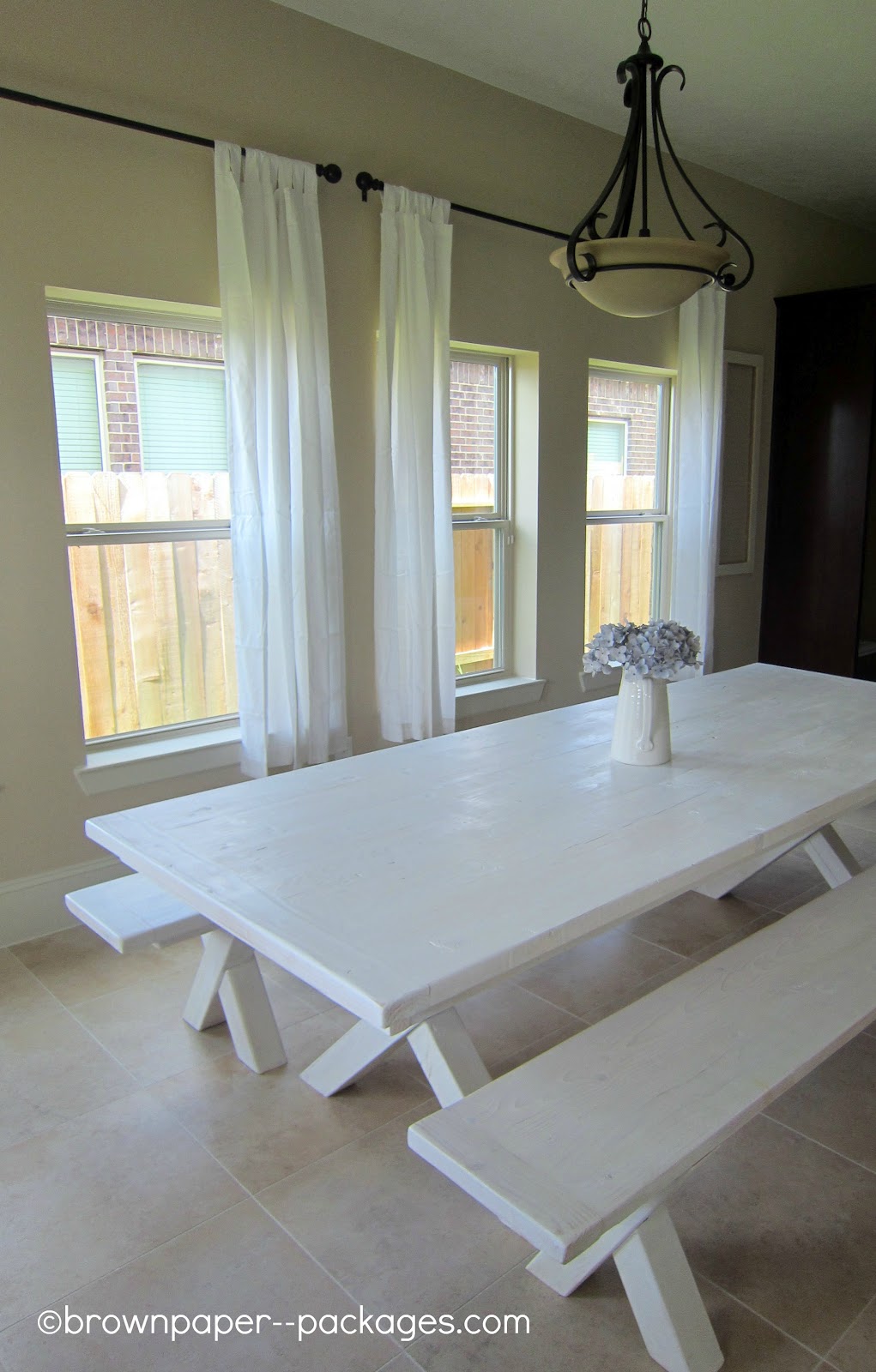 When we bought this house, I quickly realized that the square counter height table we had wouldn’t work in the rectangle dining room we would have now. As soon as I saw the space, I knew exactly what I wanted–a large, farm table with benches with a whitewashed finish–perfect for our family and entertaining friends. My husband made the table & benches the week we were moving, and I finished the whitewashing literally as they were getting ready to put it on the moving truck. I absolutely LOVE the finished product, and it was so worth hurrying to get it done before we left!